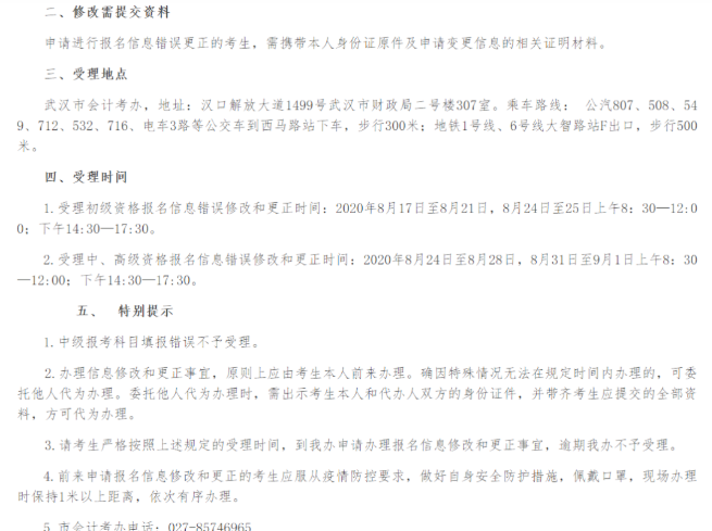 1.中級報(bào)考科目填報(bào)錯(cuò)誤不予受理。2.辦理信息修改和更正事宜,原則上應(yīng)由考生本人前來辦理。確因特殊情況無法在規(guī)定時(shí)間內(nèi)辦理的,可委托他人代為辦理。委托他人代為辦理時(shí),需出示考生本人和代辦人雙方的身份證件,并帶齊考生應(yīng)提交的全部資料,方可代為辦理。3.請考生嚴(yán)格按照上述規(guī)定的受理時(shí)間,到我辦申請辦理報(bào)名信息修改和更正事宜,逾期我辦不予受理。4.前來申請報(bào)名信息修改和更正的考生應(yīng)服從疫情防控要求,做好自身安全防護(hù)措施,佩戴口罩,現(xiàn)場辦理時(shí)保持1米以上距離,依次有序辦理。