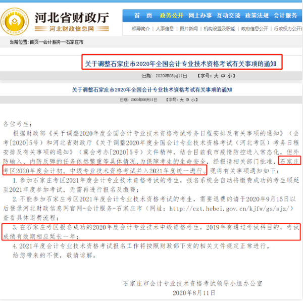 石家莊、保定、滄州考區(qū)2020年度會計初、中級專業(yè)技術(shù)資格考試并入2021年度統(tǒng)一進(jìn)行;
