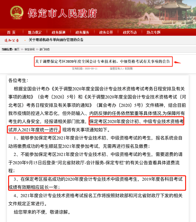 3、在保定考區(qū)報名成功的2020年度會計專業(yè)技術(shù)中級資格考生,2019年度各科目考試成績有效期相應(yīng)延長一年;