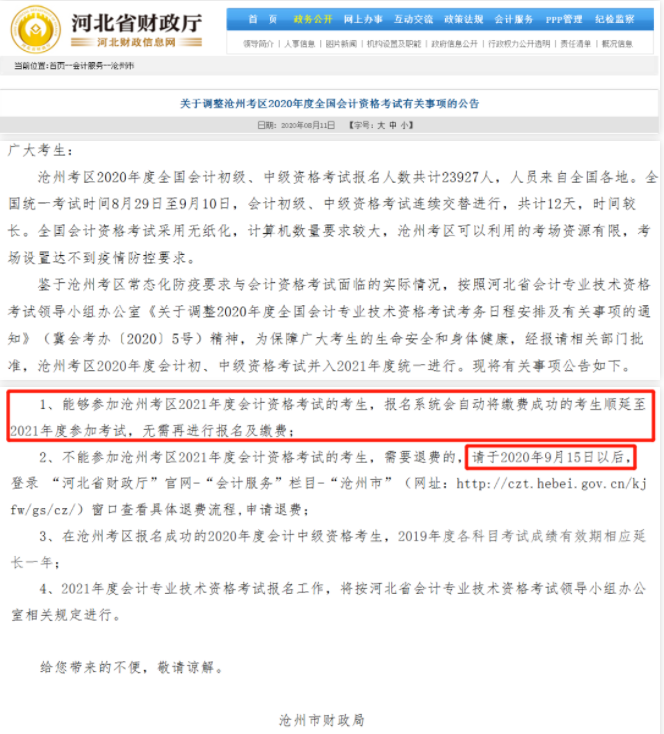2、不能參加滄州考區(qū)2021年度會計資格考試的考生,需要退費(fèi)的,請于2020年9月15日以后,登錄 “河北省財政廳”官網(wǎng)-“會計服務(wù)”欄目-“滄州市”(網(wǎng)址:http://czt.hebei.gov.cn/kjfw/gs/cz/)窗口查看具體退費(fèi)流程,申請退費(fèi);