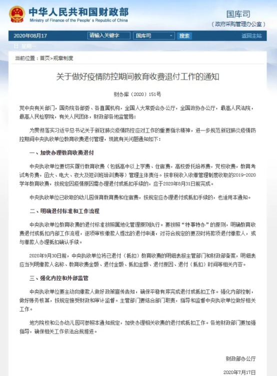 8月17日,財政部發(fā)布《關(guān)于做好疫情防控期間教育收費退付工作的通知》,通知稱中央執(zhí)收單位要切實履行教育收費(包括高中以上學(xué)費、住宿費,高校委托培養(yǎng)費,黨校收費,教育考試考務(wù)費,函大、電大、夜大及短訓(xùn)班培訓(xùn)費等)管理主體責(zé)任;要按照“特事特辦”的原則,明確教育收費退付或抵扣內(nèi)部工作流程,逐項審核繳款人提出的退付申請,對符合規(guī)定的要及時將款項退付繳款人,或與繳款人辦理抵扣確認(rèn)手續(xù);地方院校和公辦幼兒園可參照本通知規(guī)定,加快辦理相關(guān)收費的退付或抵扣工作。各地財政部門要加強指導(dǎo),確保相關(guān)工作依法合規(guī)推進。