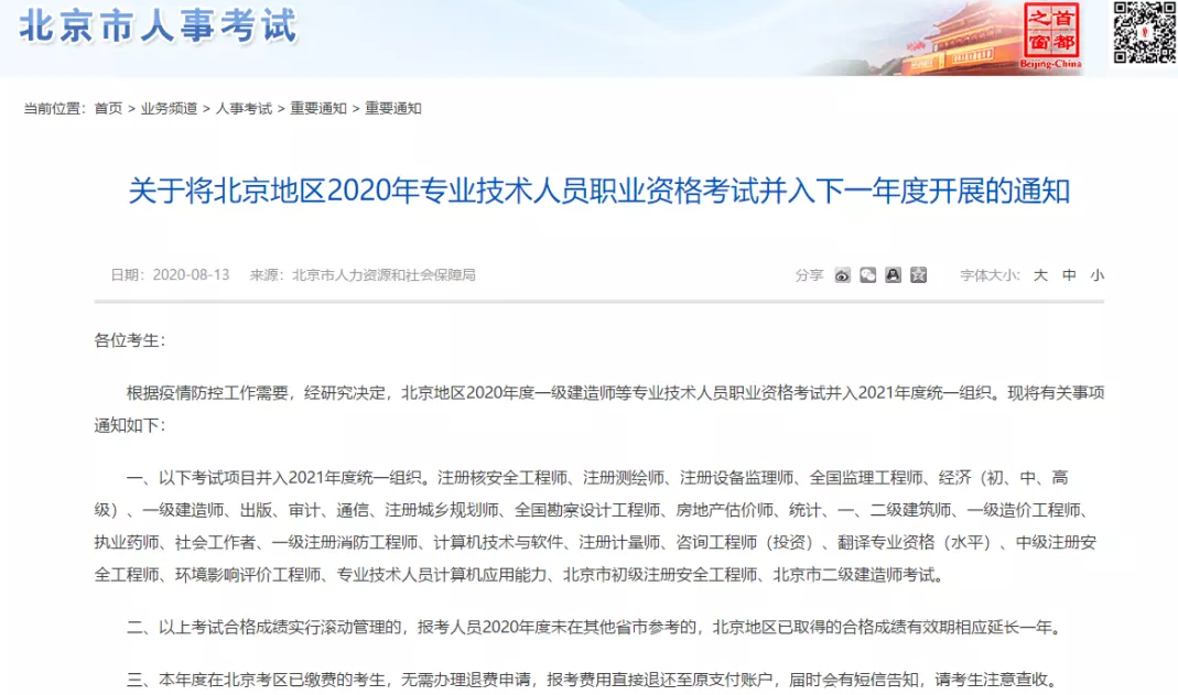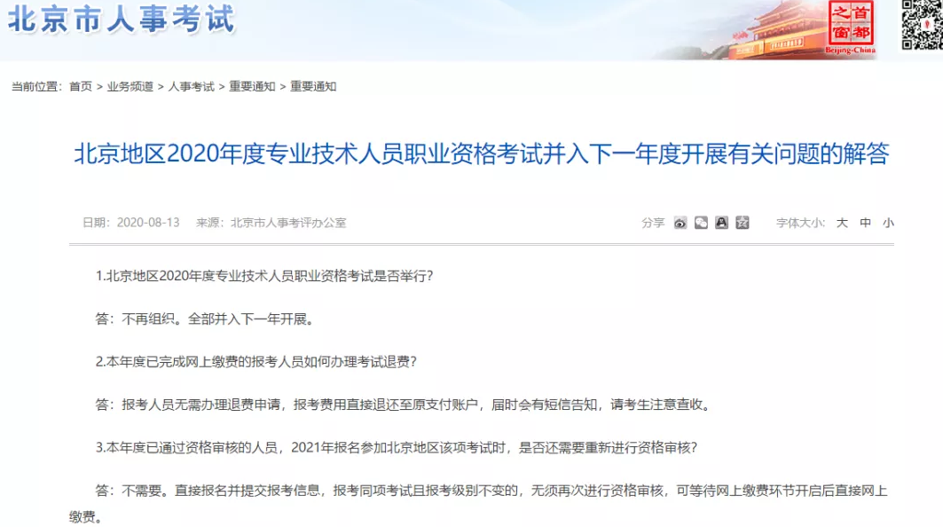根據(jù)最新消息,北京市人力資源和社會保障局在官網(wǎng)正式發(fā)布《關(guān)于將北京地區(qū)2020年專業(yè)技術(shù)人員職業(yè)資格考試并入下一年度開展的通知》。