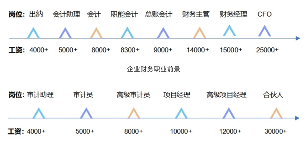 這兩種會計人員的發(fā)展方向見下圖,當(dāng)然,前提是要拿下初級會計證,然后積累工作經(jīng)驗,考下更高級別的會計證書,如中級會計師、注冊會計師等等,一步一個腳印,終究會達(dá)到你的職場巔峰。圖圖