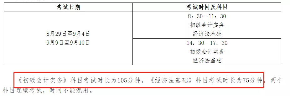 《初級會計實務(wù)》科目考試時長為105分鐘,《經(jīng)濟(jì)法基礎(chǔ)》科目考試時長為75分鐘。