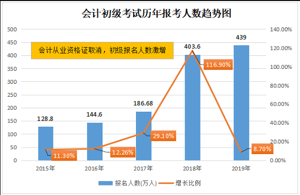 2019年初級(jí)會(huì)計(jì)考試也是由原定為9天18個(gè)批次,縮短至7天14個(gè)批次,當(dāng)時(shí)就有很多人猜測(cè)報(bào)名人數(shù)會(huì)減少,可是2019年初級(jí)會(huì)計(jì)報(bào)名人數(shù)卻達(dá)到了439萬人,比2018年(403.6萬人)增長(zhǎng)8.7%。
