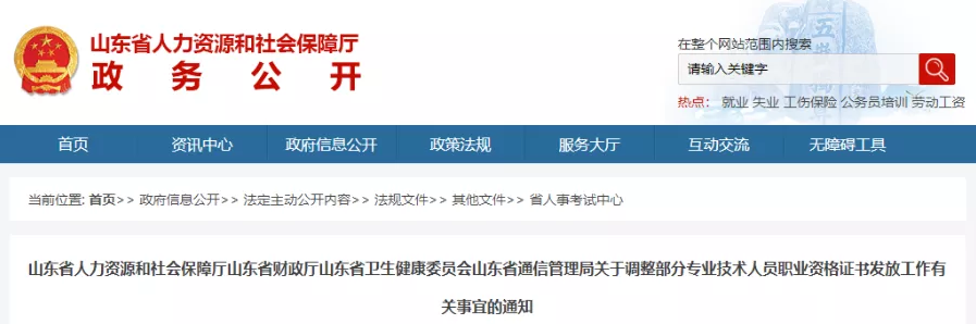 前段時間,山東省發(fā)布了《山東省人力資源和社會保障廳山東省財政廳山東省衛(wèi)生健康委員會山東省通信管理局關(guān)于調(diào)整部分專業(yè)技術(shù)人員職業(yè)資格證書發(fā)放工作有關(guān)事宜的通知》,通知中稱: