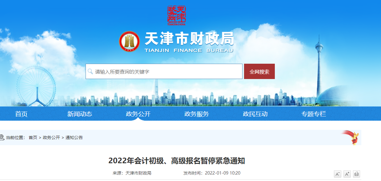 天津初級(jí)會(huì)計(jì)考生請(qǐng)注意:原定1月10日-14日組織的2022年度會(huì)計(jì)初級(jí)、高級(jí)考試報(bào)名工作暫停!詳情如下: