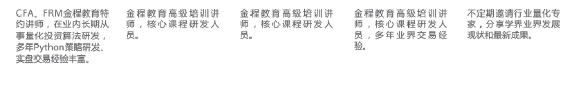 金程教育資深培訓(xùn)師,香港大學(xué)MBA,CFA/FRM持證人,金程教育Excel金融建模、量化投資課程開發(fā)負(fù)責(zé)人。