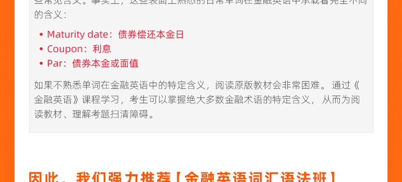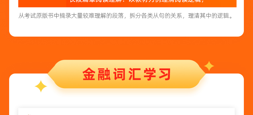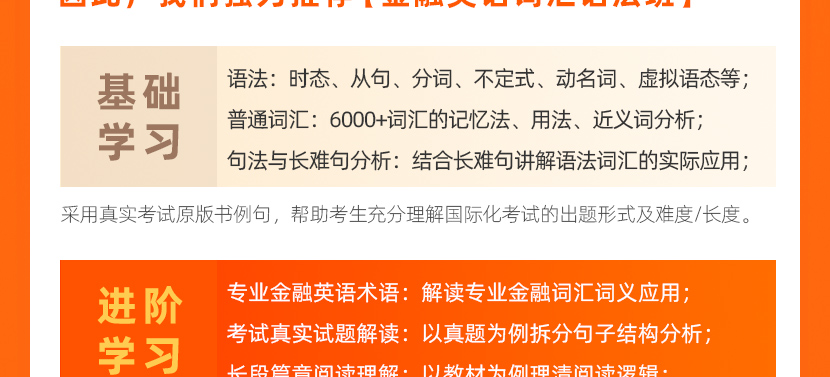 適合0基礎(chǔ)備考、金融英語基礎(chǔ)薄弱的學(xué)員,包括金融英語基礎(chǔ)語法、基礎(chǔ)詞匯和專業(yè)詞匯三個模塊,幫助考生克服備考過程中的英語障礙。