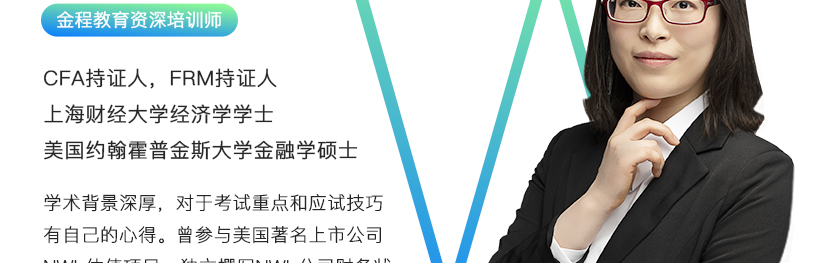金程教育資深培訓師、CFA持證人、FRM持證人、CFA SIC持證人、美國約翰霍普金斯大學金融學碩士。