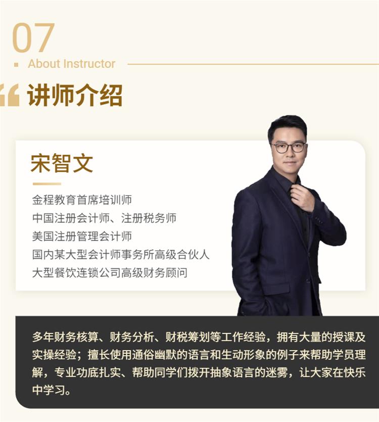 金程教育首席培訓(xùn)師;中國注冊會計師、注冊稅務(wù)師、美國注冊管理會計師。