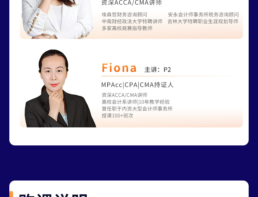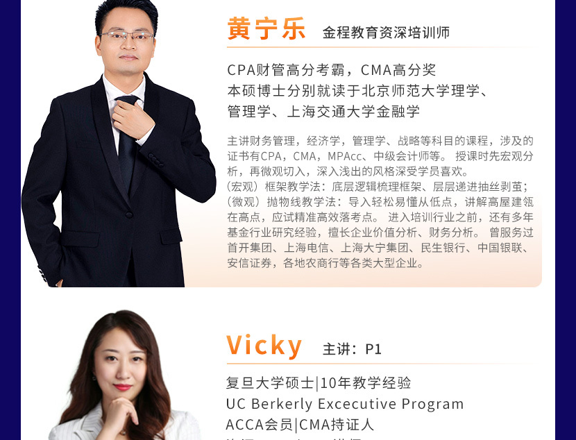 復(fù)旦大學(xué)碩士 UC Berkerly Excecutive Program ACCA會(huì)員|CMA持證人 資深A(yù)CCA/CMA講師,10年教學(xué)經(jīng)驗(yàn) 埃森哲財(cái)務(wù)咨詢(xún)顧問(wèn) 安永會(huì)計(jì)師事務(wù)所稅務(wù)咨詢(xún)顧問(wèn) 中南財(cái)經(jīng)政法大學(xué)特聘講師 吉林大學(xué)特聘職業(yè)生涯規(guī)劃導(dǎo)師 多家高校商賽指導(dǎo)教師