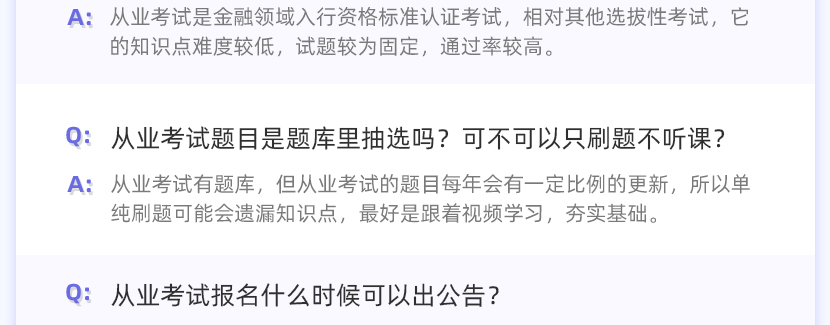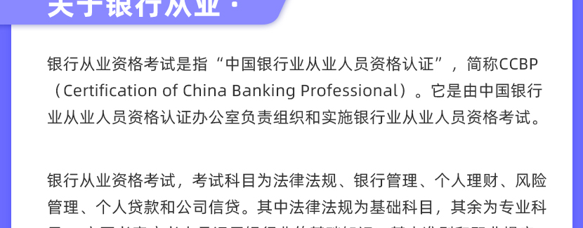 收藏 銀行從業(yè)是由中國(guó)銀行業(yè)從業(yè)人員資格認(rèn)證辦公室負(fù)責(zé)組織和實(shí)施銀行業(yè)從業(yè)人員資格考試,每年舉辦兩次。資格考試分公共基礎(chǔ)科目和專業(yè)科目。公共基礎(chǔ)證書(shū)的考試內(nèi)容為銀行業(yè)從業(yè)人員從業(yè)資格的基礎(chǔ)知識(shí),專業(yè)證書(shū)的考試內(nèi)容為銀行業(yè)從業(yè)人員相關(guān)的專業(yè)知識(shí)和技能。