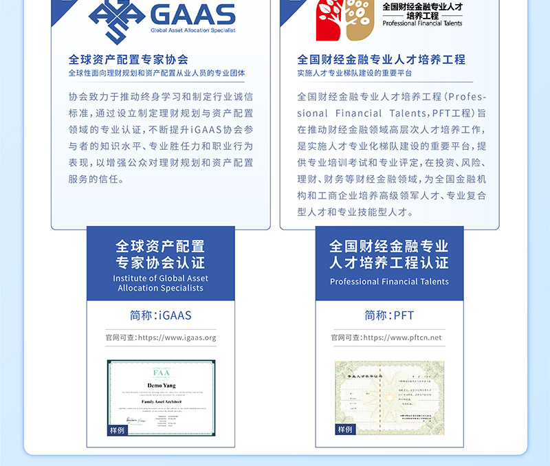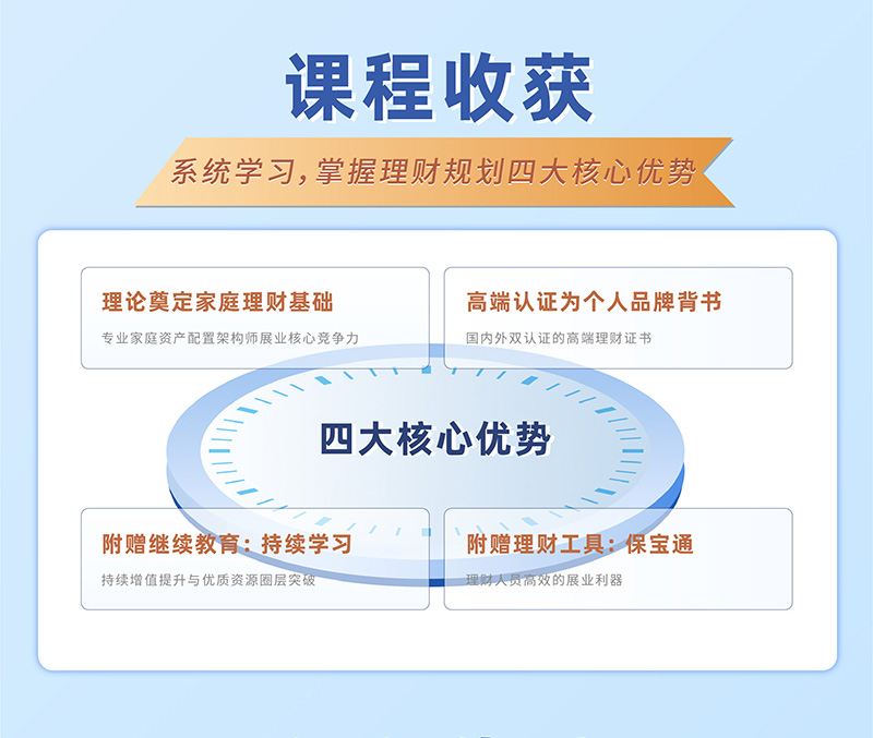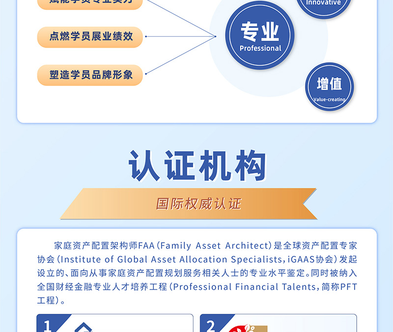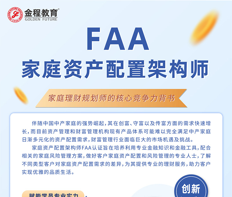 收藏 家庭資產(chǎn)配置架構(gòu)師FAA認(rèn)證旨在培養(yǎng)利用專業(yè)金融知識(shí)和金融工具,配合相關(guān)的家庭風(fēng)險(xiǎn)管理方案,做好客戶家庭資產(chǎn)配置和風(fēng)險(xiǎn)管理的專業(yè)人士,了解不同類型客戶對(duì)家庭資產(chǎn)配置需求的差異,為其提供專業(yè)的理財(cái)服務(wù),助力客戶實(shí)現(xiàn)優(yōu)雅的品質(zhì)生活。