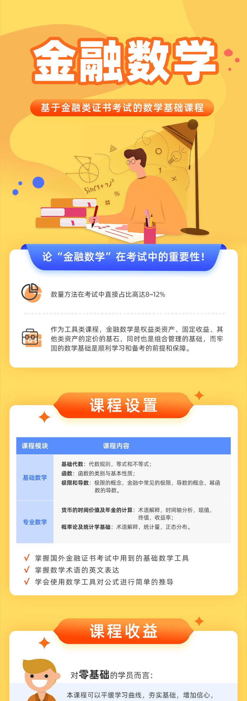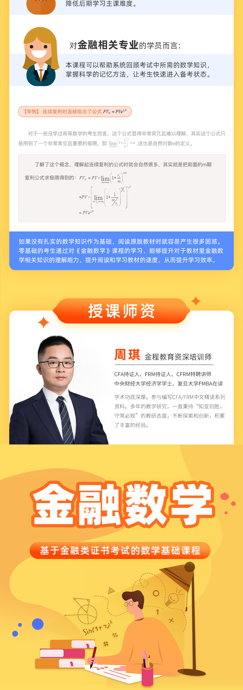適合零基礎(chǔ)備考、金融數(shù)學(xué)基礎(chǔ)薄弱的CFA&FRM備考考生。2天帶您學(xué)習(xí)金融數(shù)學(xué)基礎(chǔ)知識(shí),為CFA&FRM備考做好充足準(zhǔn)備。
