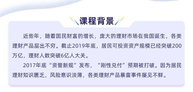 近些年,隨著國民財富的增長,龐大的理財市場在我國誕生,各類理財產(chǎn)品層出不窮。截止2019年底,居民可投資資產(chǎn)規(guī)模已經(jīng)突破200萬億,理財人數(shù)突破6億人大關(guān)。2017年底“資管新規(guī)”發(fā)布,“剛性兌付”預(yù)期被打破。因為居民理財知識匱乏,風(fēng)險意識淡薄,各類理財產(chǎn)品暴雷事件屢見不鮮。