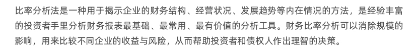 財務比率分析法是一種用于揭示企業(yè)的財務結(jié)構(gòu)、經(jīng)營狀況、發(fā)展趨勢等內(nèi)在情況的方法,是經(jīng)驗豐富的投資者手里分析財務報表最基礎、最有價值的分析工具