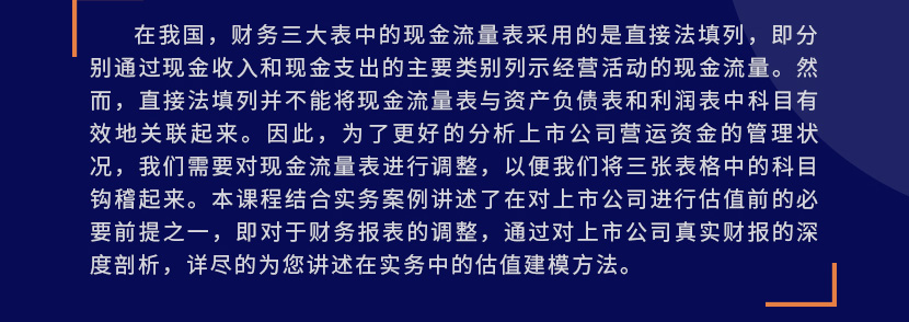 本課程結(jié)合實務(wù)案例講述了在對上市公司進行估值前的必要前提之一,即對于財務(wù)報表的調(diào)整,通過對上市公司真實財報的深度剖析,詳盡的為您講述在實務(wù)中的估值建模方法。