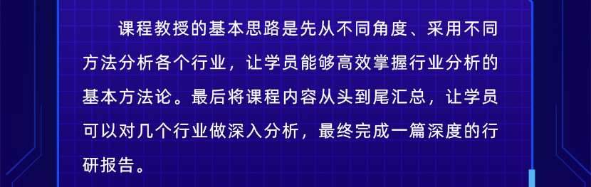 課程教授的基本思路是先從不同角度、采用不同方法分析各個(gè)行業(yè),讓學(xué)員能夠高效掌握行業(yè)分析的基本方法論。最后將課程內(nèi)容從頭到尾匯總,讓學(xué)員可以對(duì)幾個(gè)行業(yè)做深入分析,最終完成一篇深度的行研報(bào)告。