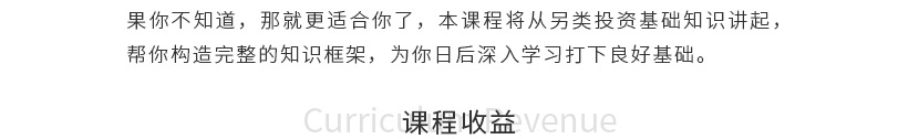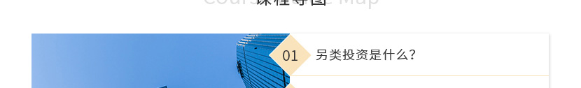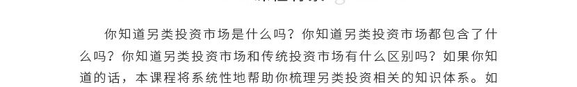 本課程將系統(tǒng)性地幫助你梳理另類投資相關(guān)的知識體系,從另類投資基礎知識講起,幫你構(gòu)造完整的知識框架,為你日后深入學習打下良好基礎。