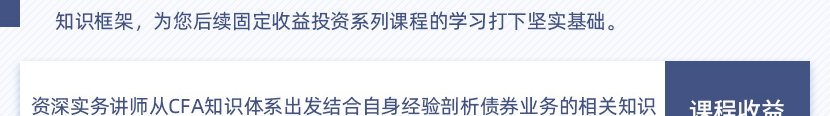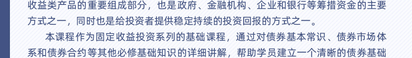 本課程作為固定收益投資系列的基礎(chǔ)課程,通過對債券基本常識、債券市場體系和債券合約等其他必修基礎(chǔ)知識的詳細講解,幫助學(xué)員建立一個清晰的債券基礎(chǔ)知識框架