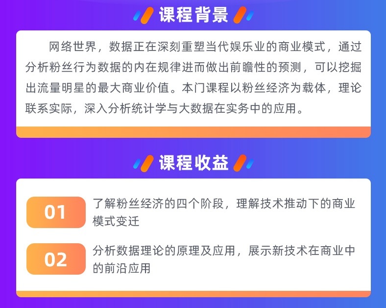收藏 網(wǎng)絡(luò)世界,數(shù)據(jù)正在深刻重塑當(dāng)代娛樂業(yè)的商業(yè)模式,通過分析粉絲行為數(shù)據(jù)的內(nèi)在規(guī)律進(jìn)而做出前瞻性的預(yù)測,可以挖掘出流量明星的最大商業(yè)價值。本門課程以粉絲經(jīng)濟(jì)為載體,理論聯(lián)系實(shí)際,深入分析統(tǒng)計(jì)學(xué)與大數(shù)據(jù)在實(shí)務(wù)中的應(yīng)用。