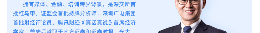 擁有媒體、金融、培訓(xùn)跨界背景,是深交所首批紅馬甲,證監(jiān)會首批持牌分析師,深圳廣電集團(tuán)首批財(cái)經(jīng)評論員。