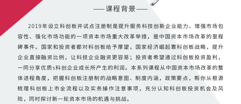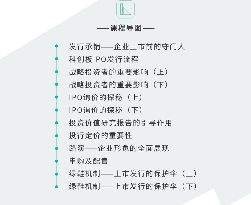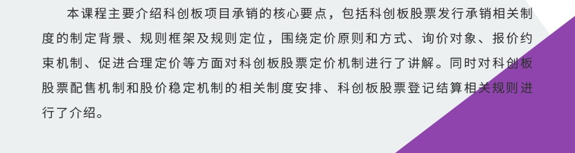 收藏 本課程主要介紹科創(chuàng)板項(xiàng)目承銷的核心要點(diǎn),包括科創(chuàng)板股票發(fā)行承銷相關(guān)制度的制定背景、規(guī)則框架及規(guī)則定位,圍繞定價(jià)原則和方式、詢價(jià)對(duì)象、報(bào)價(jià)約束機(jī)制、促進(jìn)合理定價(jià)等方面對(duì)科創(chuàng)板股票定價(jià)機(jī)制進(jìn)行了講解。同時(shí)對(duì)科創(chuàng)板股票配售機(jī)制和股價(jià)穩(wěn)定機(jī)制的相關(guān)制度安排、科創(chuàng)板股票登記結(jié)算相關(guān)規(guī)則進(jìn)行了介紹。
