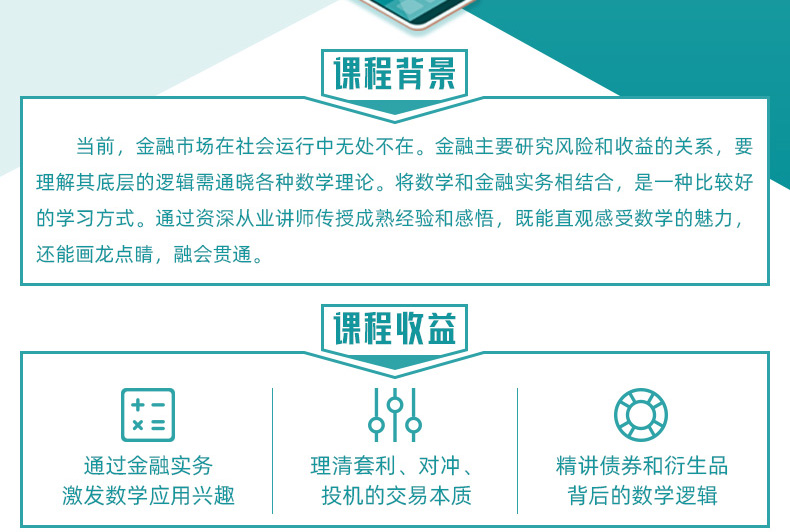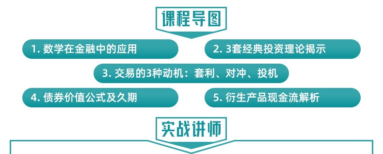 當(dāng)前,金融市場在社會運行中無處不在。金融主要研究風(fēng)險和收益的關(guān)系,要理解其底層的邏輯需通曉各種數(shù)學(xué)理論。將數(shù)學(xué)和金融實務(wù)相結(jié)合,是一種比較好的學(xué)習(xí)方式。通過資深從業(yè)講師傳授成熟經(jīng)驗和感悟,既能直觀感受數(shù)學(xué)的魅力,還能畫龍點睛,融會貫通。