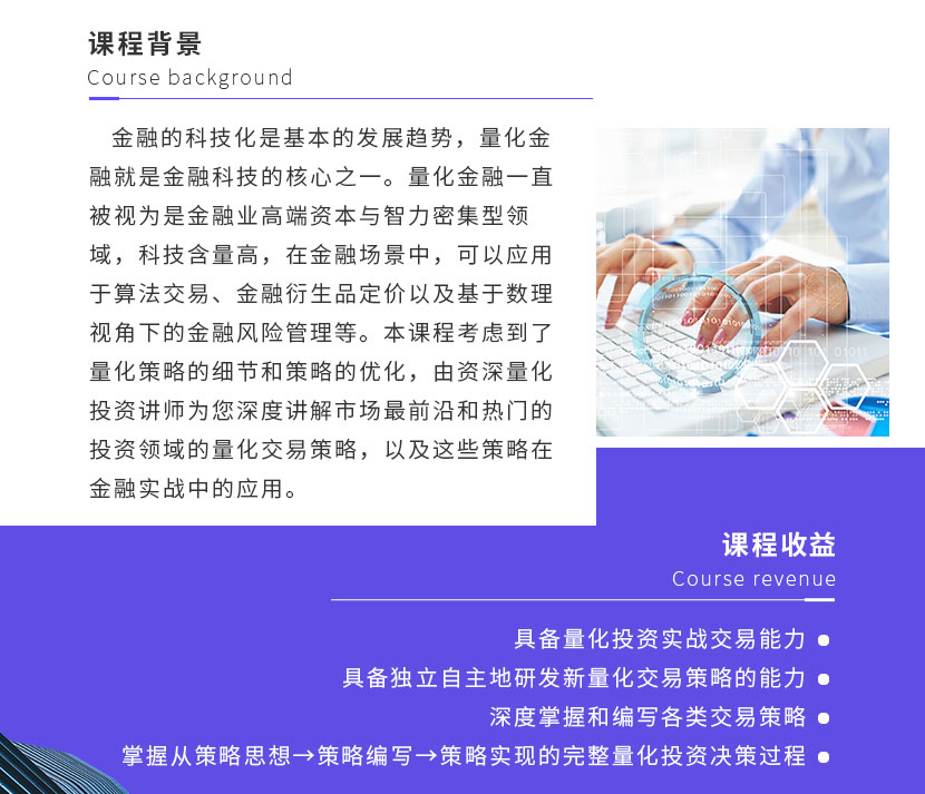 本課程考慮到了量化策略的細(xì)節(jié)和策略的優(yōu)化,由資深量化投資講師為您深度講解市場最前沿和熱門的投資領(lǐng)域的量化交易策略,以及這些策略在金融實(shí)戰(zhàn)中的應(yīng)用。