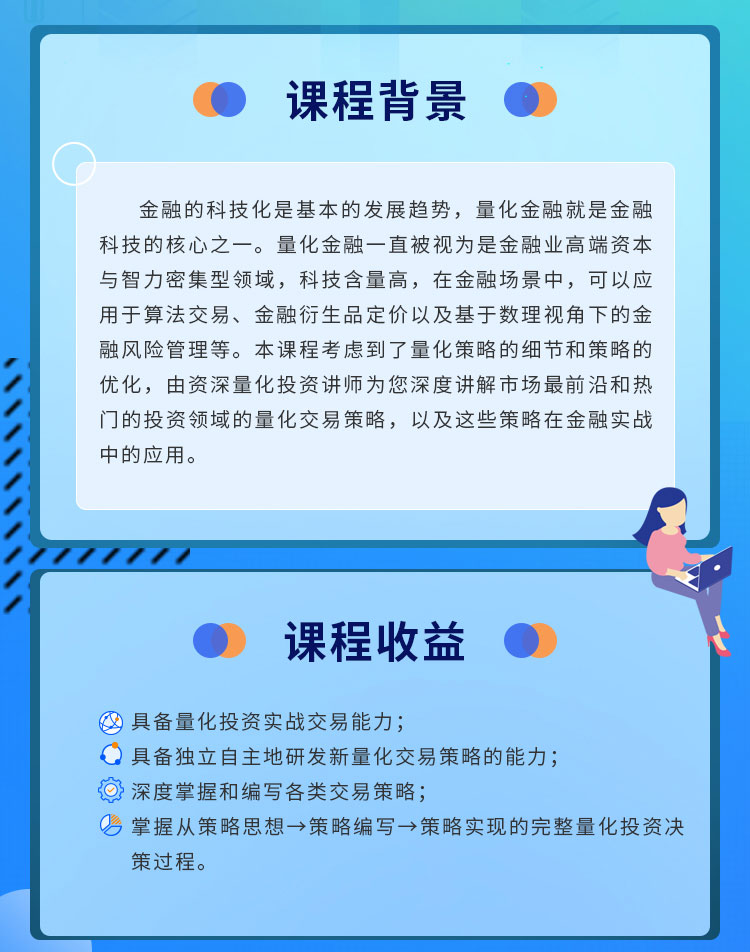 本課程考慮到了量化策略的細(xì)節(jié)和策略的優(yōu)化,由資深量化投資講師為您深度講解市場(chǎng)最前沿和熱門的投資領(lǐng)域的量化交易策略,以及這些策略在金融實(shí)戰(zhàn)中的應(yīng)用。