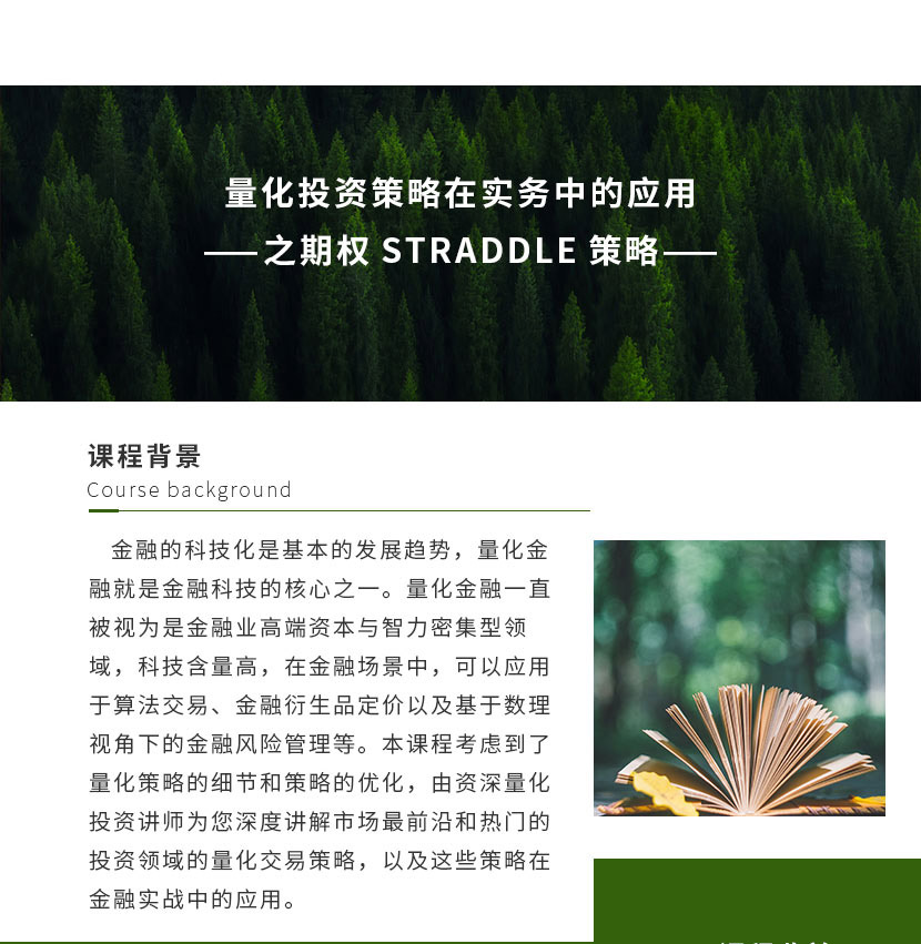 本課程考慮到了量化策略的細(xì)節(jié)和策略的優(yōu)化,由資深量化投資講師為您深度講解市場最前沿和熱門的投資領(lǐng)域的量化交易策略,以及這些策略在金融實(shí)戰(zhàn)中的應(yīng)用。