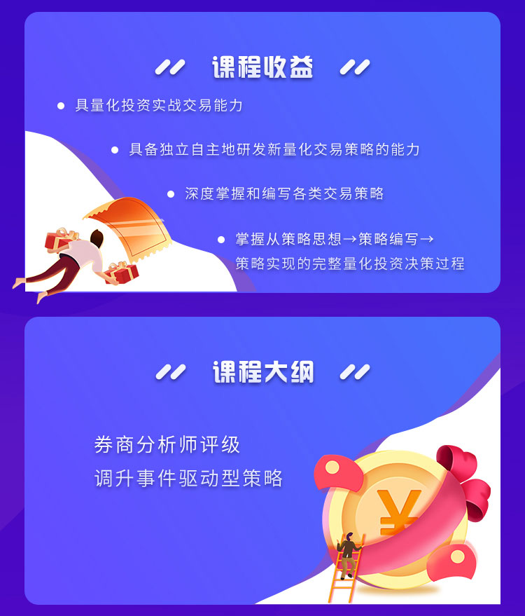 本課程考慮到了量化策略的細(xì)節(jié)和策略的優(yōu)化,由資深量化投資講師為您深度講解市場最前沿和熱門的投資領(lǐng)域的量化交易策略,以及這些策略在金融實(shí)戰(zhàn)中的應(yīng)用。
