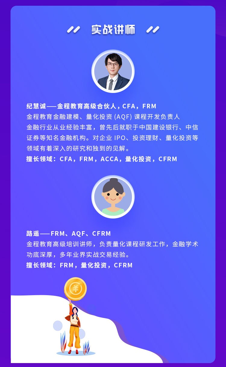 金程教育資深培訓(xùn)師,香港大學(xué)MBA,CFA/FRM持證人,金程教育Excel金融建模、量化投資課程開發(fā)負(fù)責(zé)人。