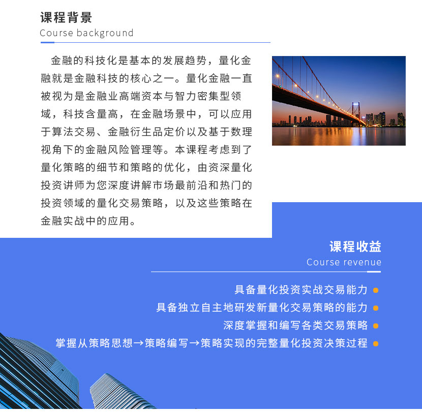 收藏 本課程考慮到了量化策略的細(xì)節(jié)和策略的優(yōu)化,由資深量化投資講師為您深度講解市場(chǎng)最前沿和熱門的投資領(lǐng)域的量化交易策略,以及這些策略在金融實(shí)戰(zhàn)中的應(yīng)用。