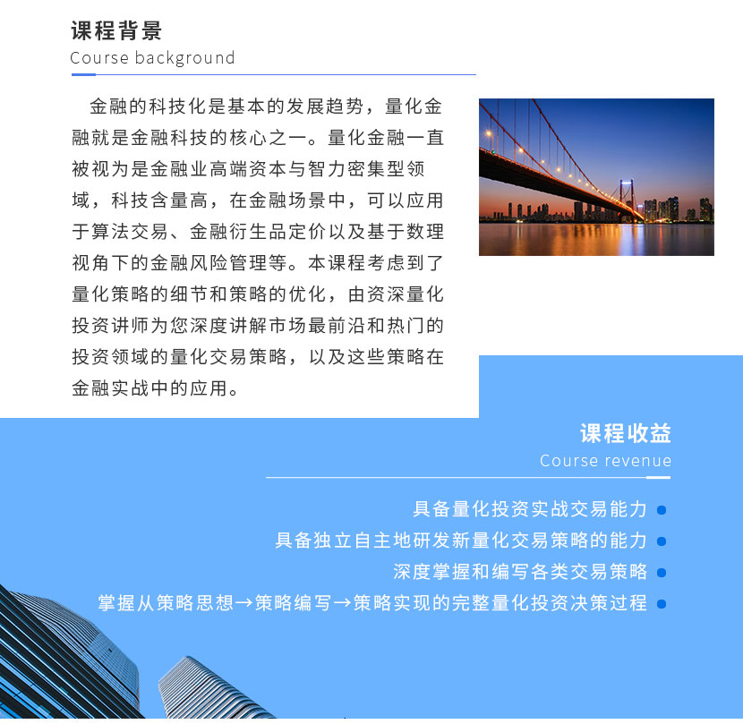 本課程考慮到了量化策略的細(xì)節(jié)和策略的優(yōu)化,由資深量化投資講師為您深度講解市場最前沿和熱門的投資領(lǐng)域的量化交易策略,以及這些策略在金融實(shí)戰(zhàn)中的應(yīng)用。