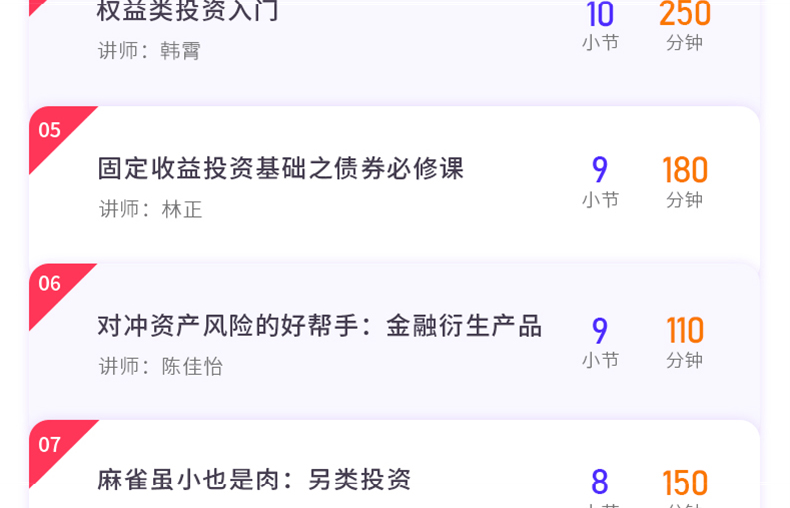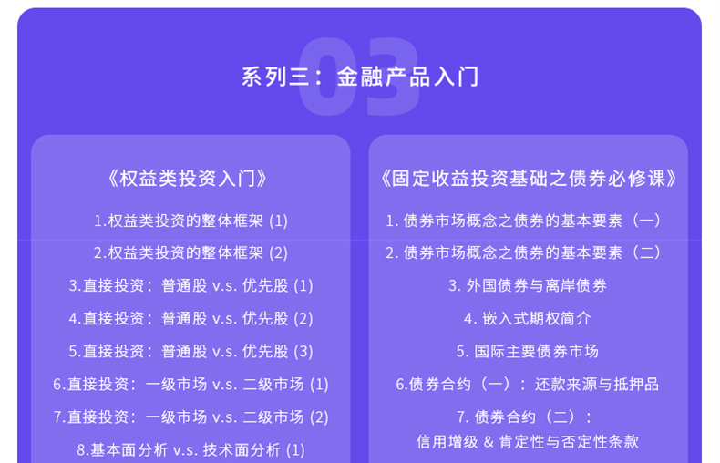 收藏 本課程將金融行業(yè)必備基礎(chǔ)知識統(tǒng)統(tǒng)囊括其中,內(nèi)容深入淺出、環(huán)環(huán)相扣,幫助學(xué)員打造完整、全面、專業(yè)的金融知識體系,為你揭開金融世界的奧秘。