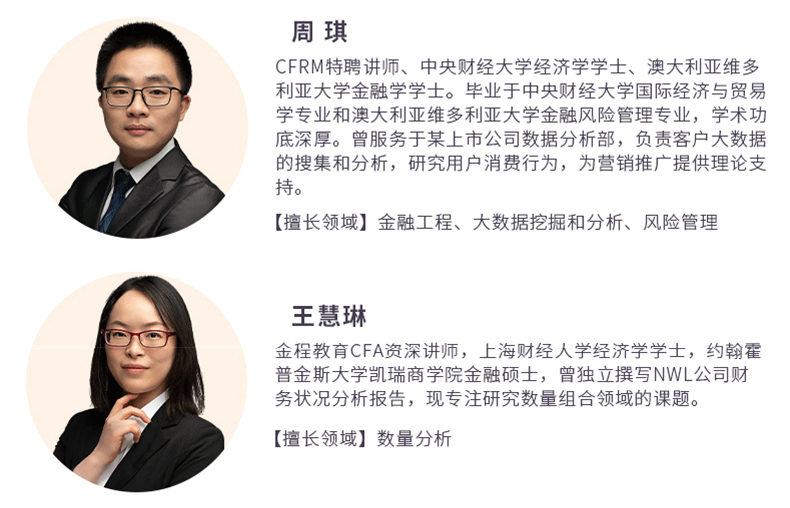 金程教育資深培訓(xùn)師、CFA持證人、FRM持證人、CFA SIC持證人、美國約翰霍普金斯大學(xué)金融學(xué)碩士。