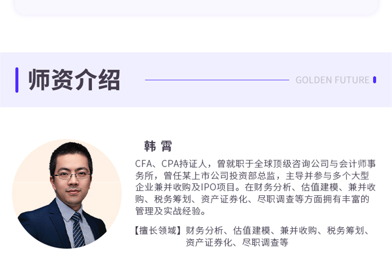 金程教育資深培訓(xùn)師、 CFA持證人、團(tuán)中央青年創(chuàng)業(yè)就業(yè)導(dǎo)師,課程清晰易懂,深受學(xué)員歡迎。