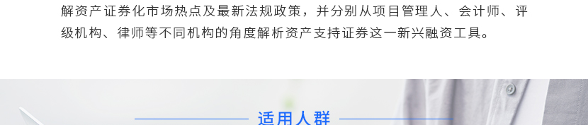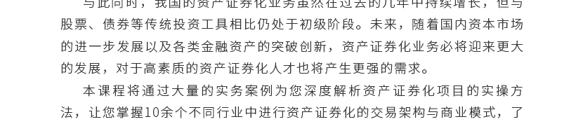 本課程將通過大量實務案例為您深度解析資產(chǎn)證券化項目的實操方法,讓從不同行業(yè)中進行資產(chǎn)證券化的交易架構與商業(yè)模式,不同中介角度解析這一新興融資工具