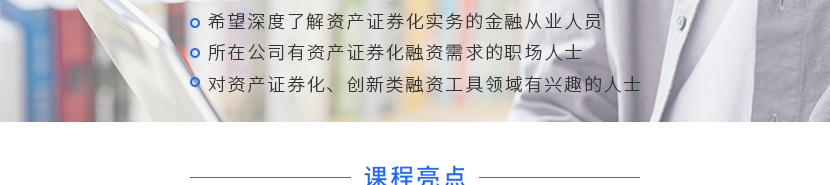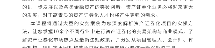 本課程將通過(guò)大量實(shí)務(wù)案例為您深度解析資產(chǎn)證券化項(xiàng)目的實(shí)操方法,讓從不同行業(yè)中進(jìn)行資產(chǎn)證券化的交易架構(gòu)與商業(yè)模式,不同中介角度解析這一新興融資工具