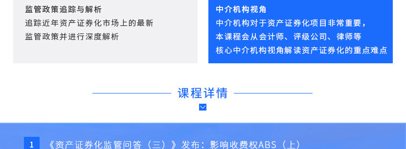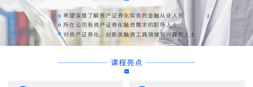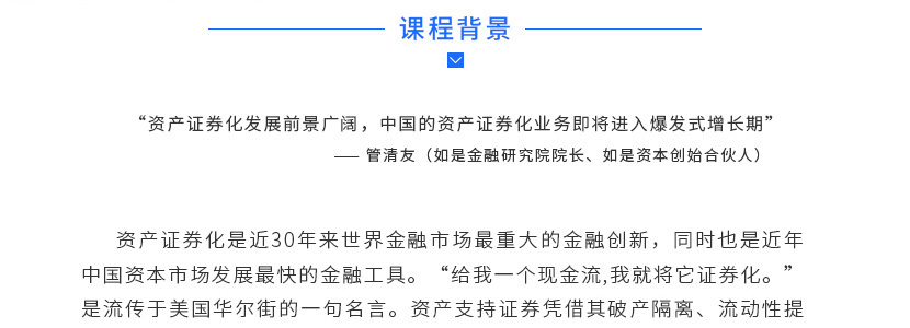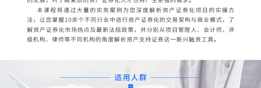 本課程將通過(guò)大量實(shí)務(wù)案例為您深度解析資產(chǎn)證券化項(xiàng)目的實(shí)操方法,讓從不同行業(yè)中進(jìn)行資產(chǎn)證券化的交易架構(gòu)與商業(yè)模式,不同中介角度解析這一新興融資工具