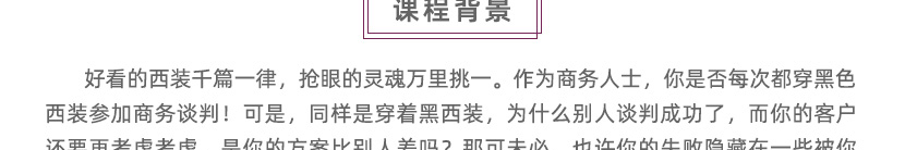 好看的西裝千篇一律,搶眼的靈魂萬里挑一。同樣是商務談判,為什么別人就能成功,職場的成功“秘訣”是什么,本課程將帶你揭秘“商務禮儀——職場成功秘訣”