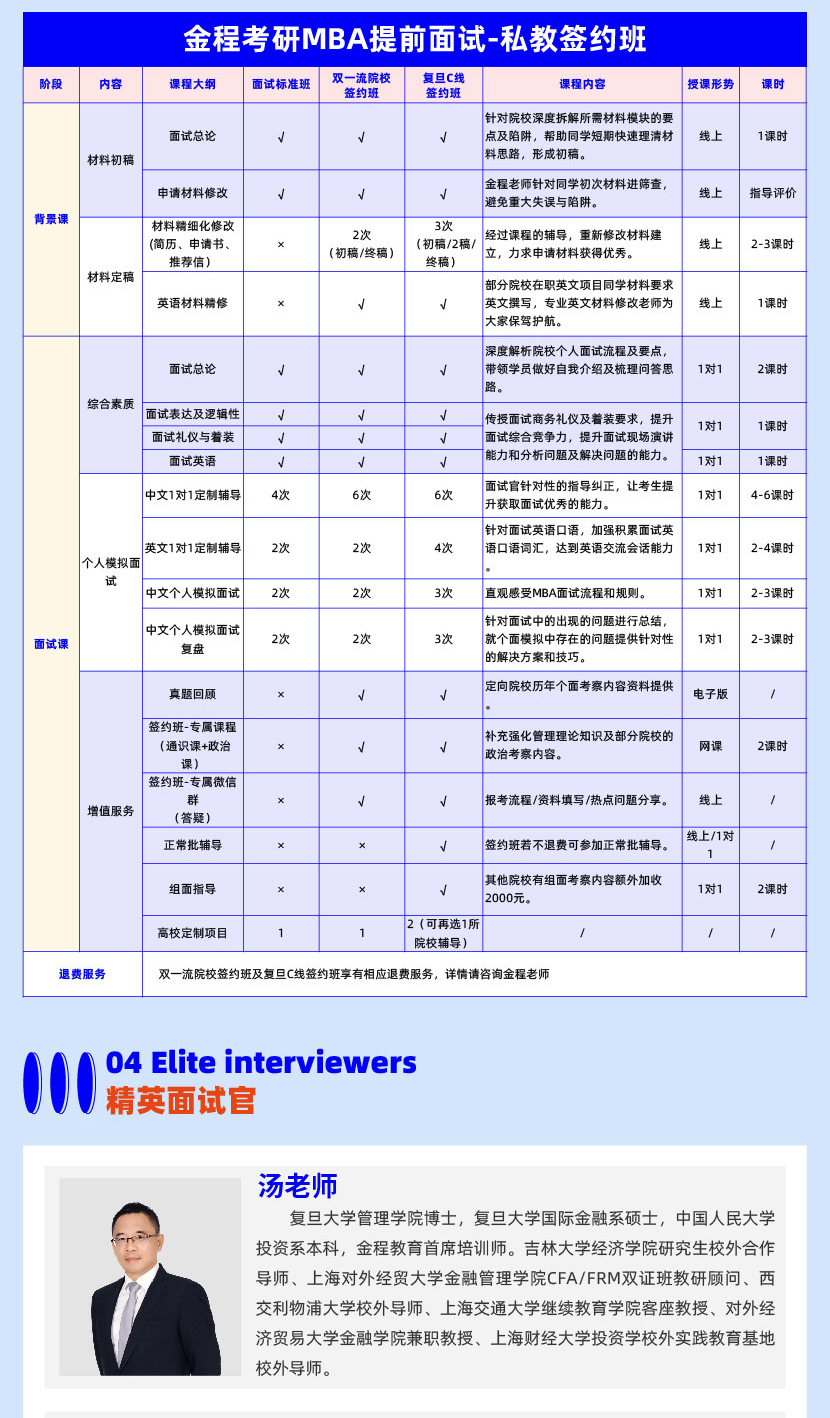 本產(chǎn)品主要針對(duì)MBA提前面試考生,課程涵蓋背景材料精修、面試指導(dǎo)以及相應(yīng)的專(zhuān)業(yè)課課程,幫助各位考生順利通過(guò)提前面試。