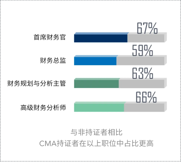 從管理層看,處于較高管理層和高級管理層的大多數(shù)受訪者都是CMA持證者,占比分別達(dá)到62%和61%。與非持證者相比,CMA持證者更有可能擔(dān)任這些職務(wù):首席財(cái)務(wù)官(67%)、財(cái)務(wù)總監(jiān)(59%)、財(cái)務(wù)規(guī)劃與分析主管(63%)和高級財(cái)務(wù)分析師(66%)。