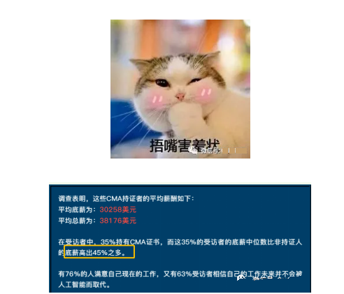 在薪酬方面較2019年數(shù)據(jù)相比,2020年CMA持證者的薪酬并沒有因?yàn)橐咔橛绊懚档?,反而還升高了,2019年的調(diào)查結(jié)果顯示CMA持證者的底薪中位數(shù)比非持證人的底薪高出45%之多,而2020年的調(diào)查結(jié)果更是出乎意料,CMA持證者的工資中位數(shù)和總收入中位數(shù),分別比非CMA持證者高出60%和63%。