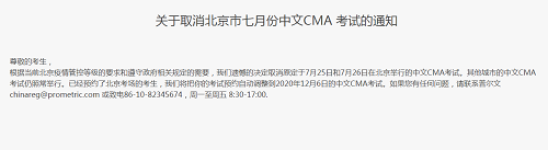 根據(jù)當(dāng)前北京疫情管控等級(jí)的要求和遵守政府相關(guān)規(guī)定的需要,我們遺憾的決定取消原定于7月25日和7月26日在北京舉行的中文CMA考試。其他城市的中文CMA 考試仍照常舉行。