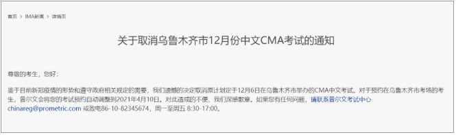 鑒于目前新冠疫情的形勢和遵守政府相關(guān)規(guī)定的需要,遺憾的決定取消原計劃定于12月6日在烏魯木齊市舉辦的CMA中文考試。