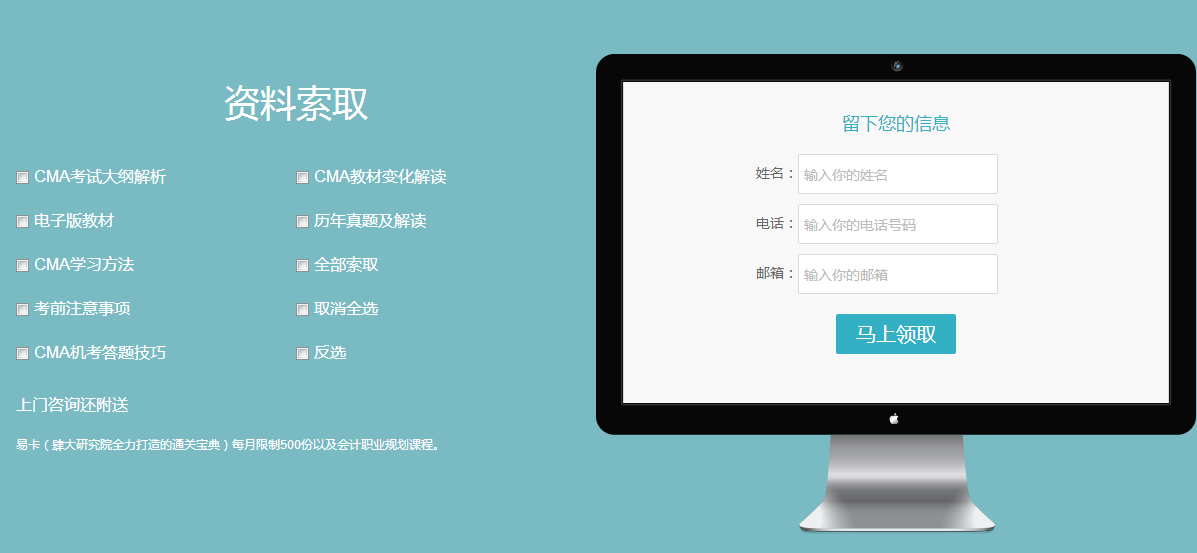 CMA免費資料下載頁面包括:CMA考試大綱解析,CMA教材變化解讀,CMA歷年真題及解讀,電子版教材,歷年真題及解讀,CMA學(xué)習(xí)方法,全部索取,考前注意事項 ,取消全選,CMA機考答題技巧,反選,上門咨詢還附送,易卡(肆大研究院全力打造的***寶典)每月限制500份以及會計職業(yè)規(guī)劃課程。