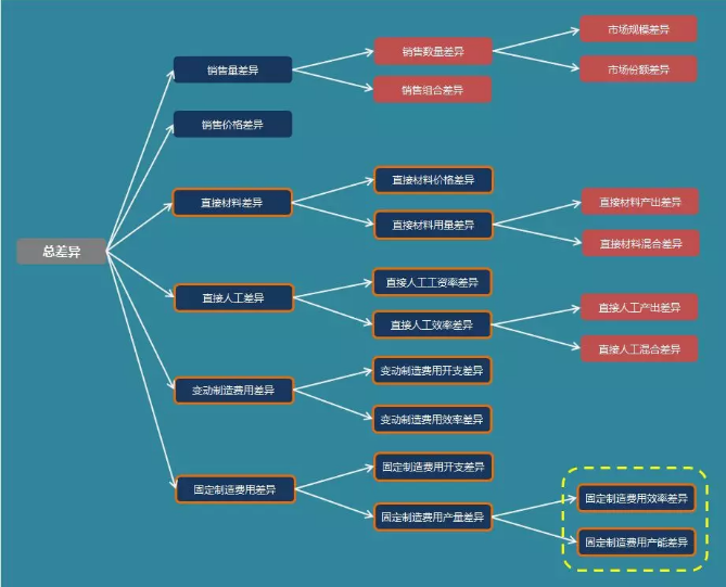 CPA:僅介紹橙色邊框的差異項目,包括直接材料差異(價格差異和用量差異)、直接人工差異(工資率差異和效率差異)、變動制造費用差異(開支差異和效率差異)、固定制造費用差異(兩因素、三因素)